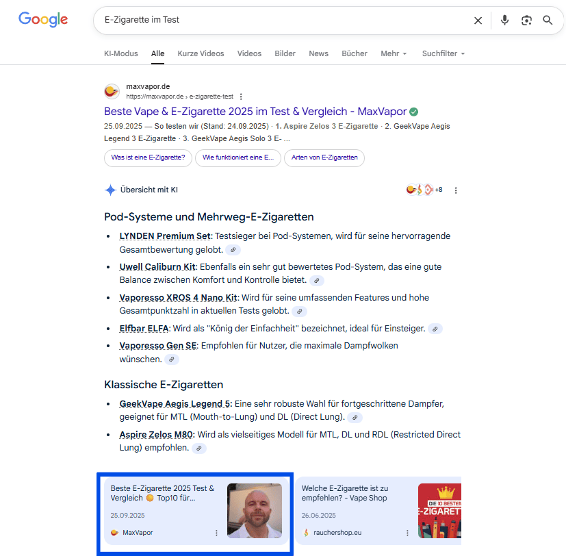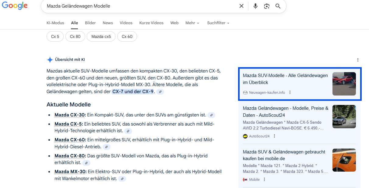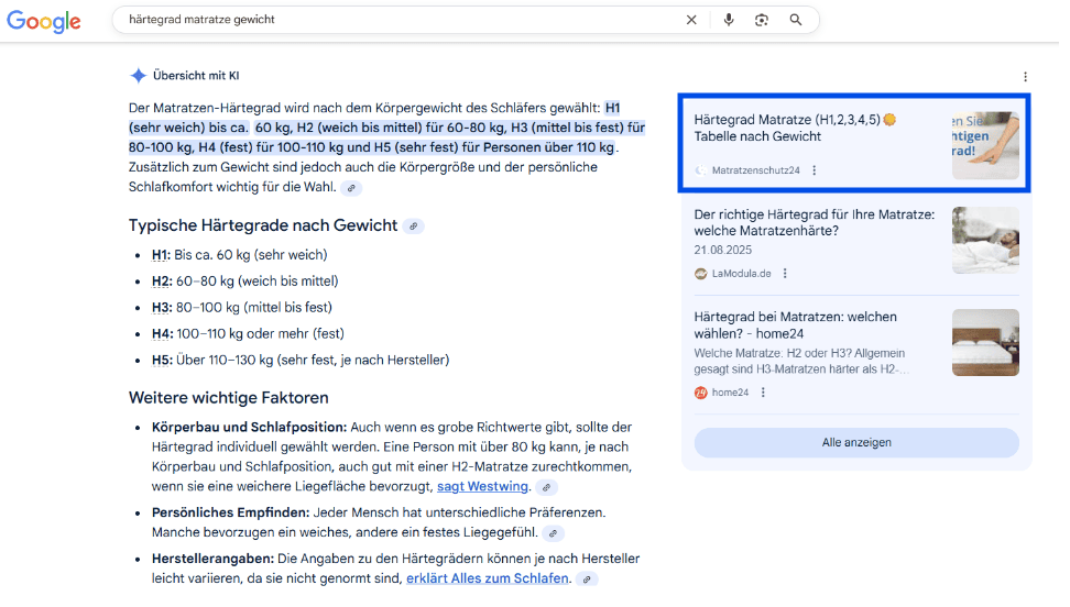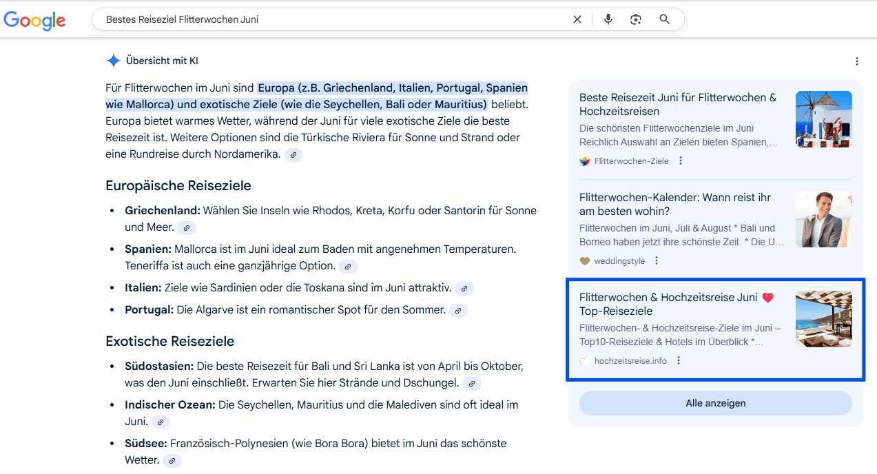 Für Sie bedeutet das: Sichtbarkeit in Suchergebnissen bleibt wichtig, reicht jedoch allein nicht mehr aus, um die eigene Zielgruppe vollständig zu erreichen und das vorhandene Conversionpotenzial auszuschöpfen. Denn immer häufiger findet Orientierung direkt in KI-Antworten statt. Das zeigt sich auch in der Suche selbst: Aktuelle Analysen zeigen zum Beispiel, dass Google AI Overviews immer häufiger vor den organischen Ergebnissen ausgespielt werden und Sichtbarkeit damit direkt in die Antwort verlagert wird – ohne dass die Nutzer eine Webseite anklicken. (Quelle: Dataslayer.ai, Google AI Overviews Impact 2025).